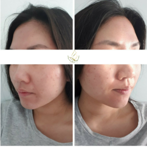 To describe her skin, it was a classic acne vulgaris case. However it was inflamed and congested. She had all the possible pimples; whiteheads, blackheads, pustules and cystic. Her most concerned area were her cheeks. It was congested, dehydrated and inflamed. It was also extremely bumpy and had the acne scarring. She wanted to have clear skin without the need of having to put on makeup everyday. But she was unable to apply her makeup well because her canvas (face) wasn’t in a great condition. She then came across Cosmetic Acupuncture, an eastern approach involving Acupuncture and Chinese Herbs.